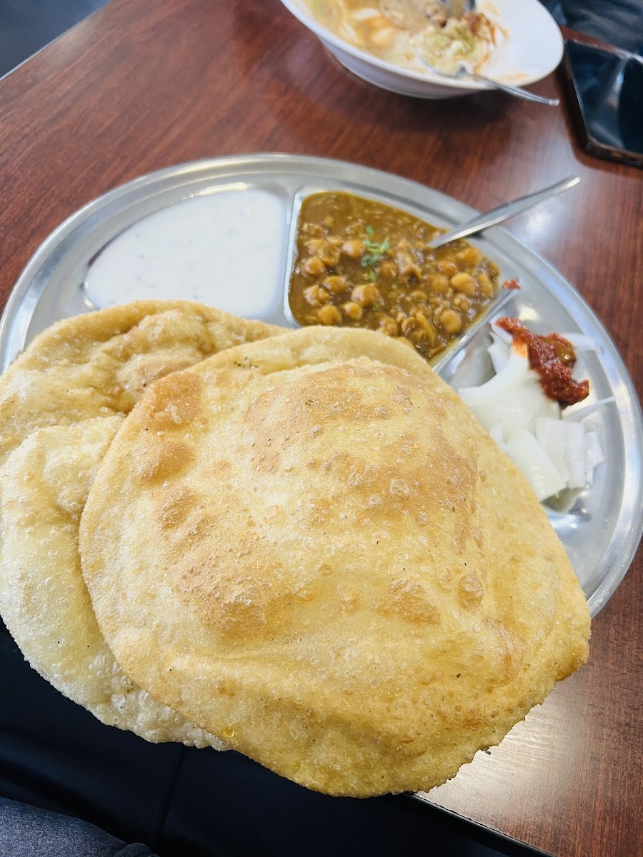 The backbone of the menu comes from North India, where rich gravies and robust breads dominate the table. Chole Bhature stands out as a true comfort dish. Fluffy deep fried bread pairs with chickpeas simmered in onion, tomato, ginger, and garam masala. It is hearty, filling, and perfect for both lunch and dinner.